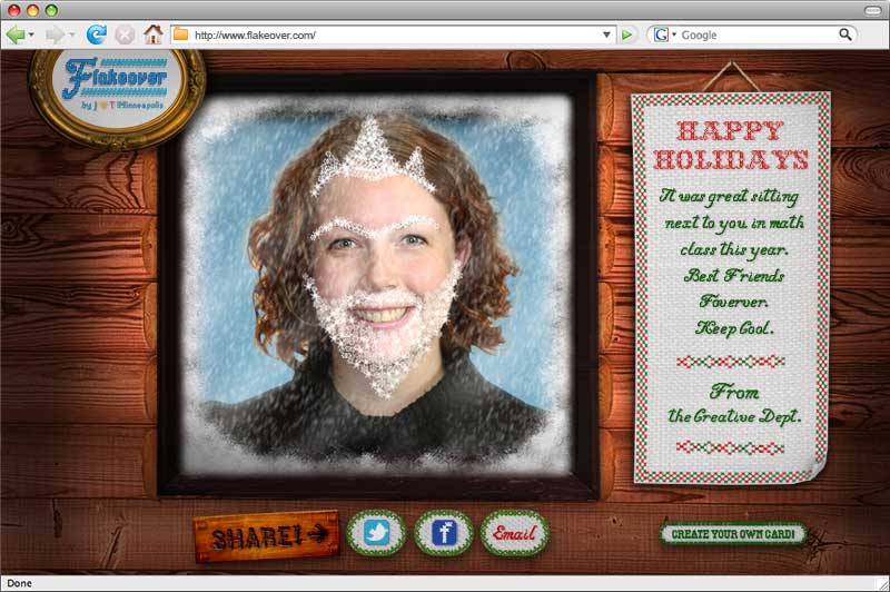 Holiday site for JWT Minneapolis. A user can upload a picture & paint a snowflake beard on it. I did the art direction & all image creation.